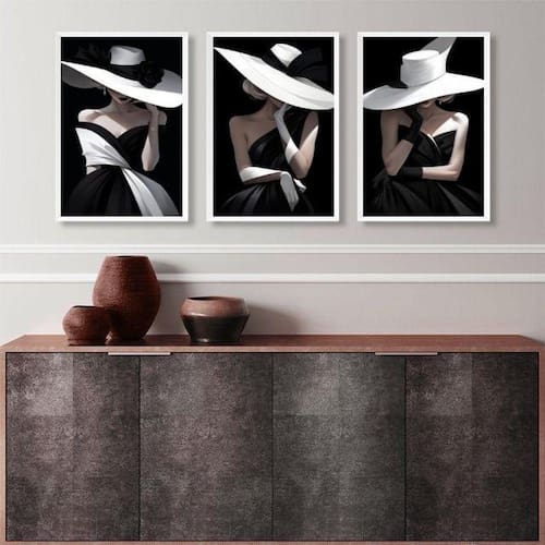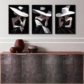 Kit 3 quadros decorativos fashion damas em preto e branco 45x34cm - com vidro Moldura: madeira preta Informações do produto tire todas as suas dúvidas no descritivo abaixo: decoração para quarto, sala, cozinha, escritório, área gourmet e muito mais. Chega de paredes vazias medidas - cada peça tem 45x34cm a3 . Material do papel - papel fotográfico brilhante de altíssima resolução acabamento - todos os quadros são acompanhados de vidro para proteção da imagem. - moldura em madeira maciça na cor preta ou branca conforme produto escolhido e pendurador . - os quadros são embalados de forma segura com plástico bolha com camada dupla de acordo com o tamanho dos quadros. Garantia - garantia de 3 meses. Meu quadro chegou. Como posso fixá-lo Você precisa apenas de um martelo e um prego, pois os quadros já vão acompanhados de penduradores. Esta é a forma mais indicada. Como posso limpar meu quadro A limpeza é feita como um móvel comum da sua casa. Apenas um pano seco ou espanador são suficientes para tal Ean: 7892739855982