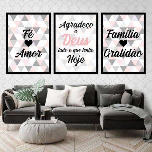 Kit 3 Quadros Decorativos Fé, Amor, Família Triângulos - Tamanho: A4 (20 x 30) / Acabamento: Película de acetato / Moldura: Madeira preta