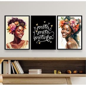 Kit 3 quadros decorativos preta preta pretinha 24x18cm - com vidro Moldura: madeira preta Informações do produto tire todas as suas dúvidas no descritivo abaixo: decoração para quarto, sala, cozinha, escritório, área gourmet e muito mais. Chega de paredes vazias medidas - cada peça tem 24x18cm a5 . Material do papel - papel fotográfico brilhante de altíssima resolução acabamento - todos os quadros são acompanhados de vidro para proteção da imagem. - moldura em madeira maciça na cor preta ou branca conforme produto escolhido e pendurador . - os quadros são embalados de forma segura com plástico bolha com camada dupla de acordo com o tamanho dos quadros. Garantia - garantia de 3 meses. Meu quadro chegou. Como posso fixá-lo Você precisa apenas de um martelo e um prego, pois os quadros já vão acompanhados de penduradores. Esta é a forma mais indicada. Como posso limpar meu quadro A limpeza é feita como um móvel comum da sua casa. Apenas um pano seco ou espanador são suficientes para tal Ean: 7896714277035