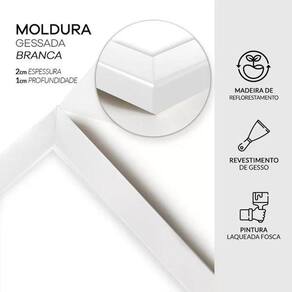 Os quadros são feitos em MDF de 3mm de espessura, e não possuem vidro. A moldura é feita com madeira reflorestada, sendo que a moldura pinus natural possui acabamentos em preto ou branco com revestimento de gesso e pintura laqueada. A espessura da moldura é de aproximadamente 1cm.