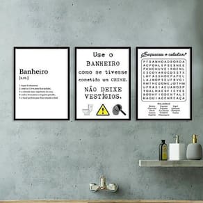 Kit 3 quadros divertidos para banheiro 45x34cm - com vidro Moldura: madeira branca Informações do produto tire todas as suas dúvidas no descritivo abaixo: decoração para quarto, sala, cozinha, escritório, área gourmet e muito mais. Chega de paredes vazias medidas - cada peça tem 45x34cm a3 . Material do papel - papel fotográfico brilhante de altíssima resolução acabamento - todos os quadros são acompanhados de vidro para proteção da imagem. - moldura em madeira maciça na cor preta e pendurador . - os quadros são embalados de forma segura com plástico bolha com camada dupla de acordo com o tamanho dos quadros. Garantia - garantia de 3 meses. Meu quadro chegou. Como posso fixá-lo Você precisa apenas de um martelo e um prego, pois os quadros já vão acompanhados de penduradores. Esta é a forma mais indicada. Como posso limpar meu quadro A limpeza é feita como um móvel comum da sua casa. Apenas um pano seco ou espanador são suficientes para tal