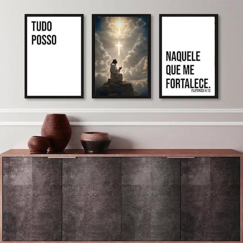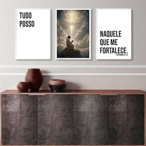 Kit 3 quadros evangélicos tudo posso naquele que me fortalece 24x18cm - com vidro Moldura: madeira branca Informações do produto tire todas as suas dúvidas no descritivo abaixo: decoração para quarto, sala, cozinha, escritório, área gourmet e muito mais. Chega de paredes vazias medidas - cada peça tem 24x18cm a5 . Material do papel - papel fotográfico brilhante de altíssima resolução acabamento - todos os quadros são acompanhados de vidro para proteção da imagem. - moldura em madeira maciça na cor preta ou branca conforme produto escolhido e pendurador . - os quadros são embalados de forma segura com plástico bolha com camada dupla de acordo com o tamanho dos quadros. Garantia - garantia de 3 meses. Meu quadro chegou. Como posso fixá-lo Você precisa apenas de um martelo e um prego, pois os quadros já vão acompanhados de penduradores. Esta é a forma mais indicada. Como posso limpar meu quadro A limpeza é feita como um móvel comum da sua casa. Apenas um pano seco ou espanador são suficientes para tal Ean: 7899627952341