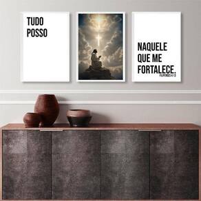 Kit 3 quadros evangélicos tudo posso naquele que me fortalece 33x24cm Moldura: madeira branca Informações do produto tire todas as suas dúvidas no descritivo abaixo: decoração para quarto, sala, cozinha, escritório, área gourmet e muito mais. Chega de paredes vazias medidas - cada peça tem 33x24cm a4 . Material do papel - papel fotográfico brilhante de altíssima resolução acabamento - todos os quadros são acompanhados de uma película de acetato para proteção da imagem. - os quadros são embalados de forma segura com plástico bolha com camada dupla de acordo com o tamanho dos quadros. Garantia - garantia de 3 meses. Meu quadro chegou. Como posso fixá-lo Você precisa apenas de um martelo e um prego, pois os quadros já vão acompanhados de penduradores. Esta é a forma mais indicada. Caso prefira, você pode utilizar uma fita dupla face neste caso, sugerimos de alta qualidade para evitar que descole e seu quadro caia . Como posso limpar meu quadro A limpeza é feita como um móvel comum da sua casa. Apenas um pano seco ou espanador são suficientes para tal Ean: 7892874852945