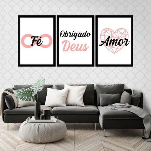 Kit 3 Quadros Fé, Obrigado Deus E Amor 24X18Cm Moldura: madeira branca