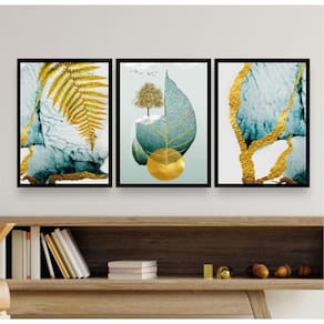 Especificações Técnicas: - Título: Kit 3 Quadros Folha Dourada Verde Água 24x18cm - Com Vidro - Medidas: Cada peça tem 24x18cm A5 - Material do papel: Papel fotográfico brilhante de altíssima resolução - Acabamento: Vidro para proteção da imagem - Moldura: Madeira branca - Pendurador: Sim, acompanha penduradores - Embalagem: Plástico bolha com camada dupla para segurança dos quadros - Garantia: 3 meses