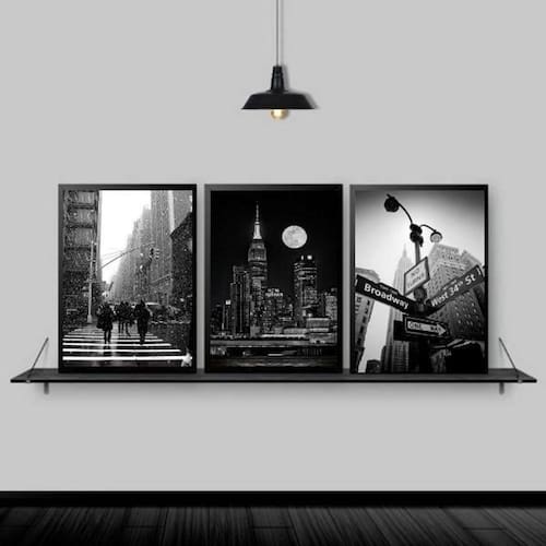 Kit 3 quadros fotografias new york 33x24cm - com vidro Moldura: madeira preta Informações do produto tire todas as suas dúvidas no descritivo abaixo: decoração para quarto, sala, cozinha, escritório, área gourmet e muito mais. Chega de paredes vazias medidas - cada peça tem 33x24cm a4 . Material do papel - papel fotográfico brilhante de altíssima resolução acabamento - todos os quadros são acompanhados de vidro para proteção da imagem. - moldura em madeira maciça na cor preta e pendurador . - os quadros são embalados de forma segura com plástico bolha com camada dupla de acordo com o tamanho dos quadros. Garantia - garantia de 3 meses. Meu quadro chegou. Como posso fixá-lo Você precisa apenas de um martelo e um prego, pois os quadros já vão acompanhados de penduradores. Esta é a forma mais indicada. Como posso limpar meu quadro A limpeza é feita como um móvel comum da sua casa. Apenas um pano seco ou espanador são suficientes para tal