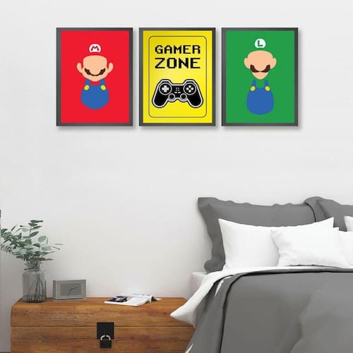 O Kit 3 Quadros Para Quarto Gamer Zone Coloridos 33X24Cm é perfeito para os amantes de jogos que desejam decorar seu ambiente com estilo e personalidade. Com uma moldura de madeira preta, os quadros são ideais para serem utilizados em quartos, salas, cozinhas, escritórios, áreas gourmet e muito mais. Chega de paredes vazias!