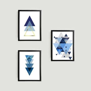 Kit 3 quadros geométricos triângulos azuis 24x18cm - com vidro Moldura: madeira branca Informações do produto tire todas as suas dúvidas no descritivo abaixo: decoração para quarto, sala, cozinha, escritório, área gourmet e muito mais. Chega de paredes vazias medidas - cada peça tem 24x18cm a5 . Material do papel - papel fotográfico brilhante de altíssima resolução acabamento - todos os quadros são acompanhados de vidro para proteção da imagem. - moldura em madeira maciça na cor preta e pendurador . - os quadros são embalados de forma segura com plástico bolha com camada dupla de acordo com o tamanho dos quadros. Garantia - garantia de 3 meses. Meu quadro chegou. Como posso fixá-lo Você precisa apenas de um martelo e um prego, pois os quadros já vão acompanhados de penduradores. Esta é a forma mais indicada. Como posso limpar meu quadro A limpeza é feita como um móvel comum da sua casa. Apenas um pano seco ou espanador são suficientes para tal