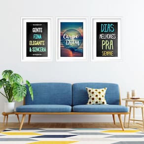 Kit 3 quadros grandes carpe diem 60x48cm Cor: moldura preta Informações do produto tire todas as suas dúvidas no descritivo abaixo: decoração para quarto, sala, cozinha, escritório, área gourmet e muito mais. Chega de paredes vazias medidas - cada peça tem 60x48cm . Material do papel - papel fotográfico brilhante de altíssima resolução acabamento - todos os quadros são acompanhados de vidro para proteção da imagem. - moldura em madeira maciça na cor preta ou branca conforme produto escolhido e pendurador. - paspatur branco com 7cm de largura - os quadros são embalados de forma segura com plástico bolha com camada dupla de acordo com o tamanho dos quadros. - de 3 meses. Meu quadro chegou. Como posso fixá-lo Você precisa apenas de um martelo e um prego, pois os quadros já vão acompanhados de penduradores. Esta é a forma mais indicada. Como posso limpar meu quadro A limpeza é feita como um móvel comum da sua casa. Apenas um pano seco ou espanador são suficientes para tal