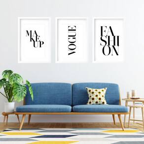 Kit 3 quadros grandes frases moda 60x48cm Cor: moldura branca Informações do produto tire todas as suas dúvidas no descritivo abaixo: decoração para quarto, sala, cozinha, escritório, área gourmet e muito mais. Chega de paredes vazias medidas - cada peça tem 60x48cm . Material do papel - papel fotográfico brilhante de altíssima resolução acabamento - todos os quadros são acompanhados de vidro para proteção da imagem. - moldura em madeira maciça na cor preta ou branca conforme produto escolhido e pendurador. - paspatur branco com 7cm de largura - os quadros são embalados de forma segura com plástico bolha com camada dupla de acordo com o tamanho dos quadros. - de 3 meses. Meu quadro chegou. Como posso fixá-lo Você precisa apenas de um martelo e um prego, pois os quadros já vão acompanhados de penduradores. Esta é a forma mais indicada. Como posso limpar meu quadro A limpeza é feita como um móvel comum da sua casa. Apenas um pano seco ou espanador são suficientes para tal