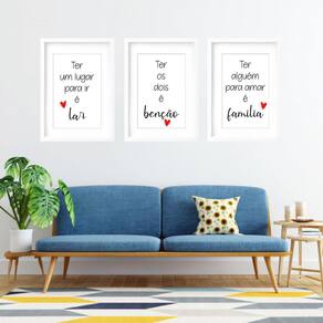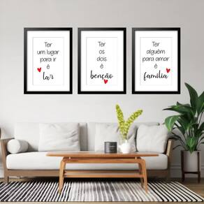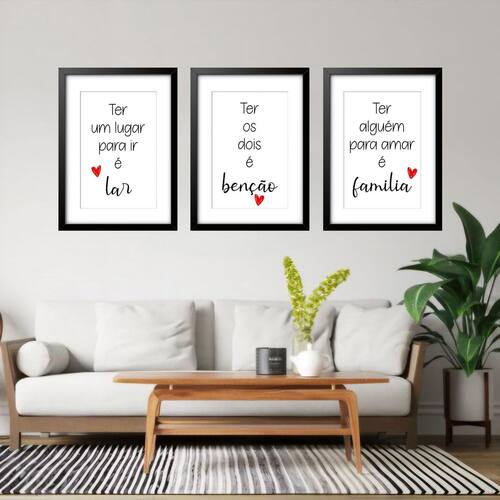 Kit 3 quadros grandes lar benção família 60x48cm Cor: moldura preta Informações do produto tire todas as suas dúvidas no descritivo abaixo: decoração para quarto, sala, cozinha, escritório, área gourmet e muito mais. Chega de paredes vazias medidas - cada peça tem 60x48cm . Material do papel - papel fotográfico brilhante de altíssima resolução acabamento - todos os quadros são acompanhados de vidro para proteção da imagem. - moldura em madeira maciça na cor preta ou branca conforme produto escolhido e pendurador. - paspatur branco com 7cm de largura - os quadros são embalados de forma segura com plástico bolha com camada dupla de acordo com o tamanho dos quadros. - de 3 meses. Meu quadro chegou. Como posso fixá-lo Você precisa apenas de um martelo e um prego, pois os quadros já vão acompanhados de penduradores. Esta é a forma mais indicada. Como posso limpar meu quadro A limpeza é feita como um móvel comum da sua casa. Apenas um pano seco ou espanador são suficientes para tal Ean: 7908991742844