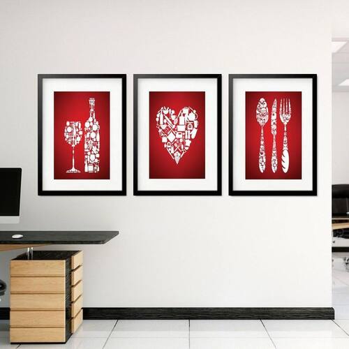 Kit 3 quadros grandes love kitchen 60x48cm Cor: moldura branca Informações do produto tire todas as suas dúvidas no descritivo abaixo: decoração para quarto, sala, cozinha, escritório, área gourmet e muito mais. Chega de paredes vazias medidas - cada peça tem 60x48cm . Material do papel - papel fotográfico brilhante de altíssima resolução acabamento - todos os quadros são acompanhados de vidro para proteção da imagem. - moldura em madeira maciça na cor preta ou branca conforme produto escolhido e pendurador. - paspatur branco com 7cm de largura - os quadros são embalados de forma segura com plástico bolha com camada dupla de acordo com o tamanho dos quadros. - de 3 meses. Meu quadro chegou. Como posso fixá-lo Você precisa apenas de um martelo e um prego, pois os quadros já vão acompanhados de penduradores. Esta é a forma mais indicada. Como posso limpar meu quadro A limpeza é feita como um móvel comum da sua casa. Apenas um pano seco ou espanador são suficientes para tal Marca: Não Informado