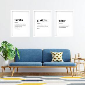 Kit 3 quadros grandes significados família gratidão amor 60x48cm Cor: moldura branca Informações do produto tire todas as suas dúvidas no descritivo abaixo: decoração para quarto, sala, cozinha, escritório, área gourmet e muito mais. Chega de paredes vazias medidas - cada peça tem 60x48cm . Material do papel - papel fotográfico brilhante de altíssima resolução acabamento - todos os quadros são acompanhados de vidro para proteção da imagem. - moldura em madeira maciça na cor preta ou branca conforme produto escolhido e pendurador. - paspatur branco com 7cm de largura - os quadros são embalados de forma segura com plástico bolha com camada dupla de acordo com o tamanho dos quadros. - de 3 meses. Meu quadro chegou. Como posso fixá-lo Você precisa apenas de um martelo e um prego, pois os quadros já vão acompanhados de penduradores. Esta é a forma mais indicada. Como posso limpar meu quadro A limpeza é feita como um móvel comum da sua casa. Apenas um pano seco ou espanador são suficientes para tal Ean: 7908991742998