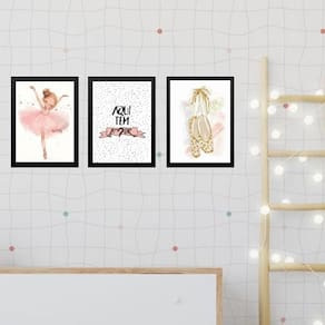 Kit 3 quadros infantis bailarina - amor 24x18cm - com vidro Moldura: madeira preta Informações do produto tire todas as suas dúvidas no descritivo abaixo: decoração para quarto, sala, cozinha, escritório, área gourmet e muito mais. Chega de paredes vazias medidas - cada peça tem 24x18cm a5 . Material do papel - papel fotográfico brilhante de altíssima resolução acabamento - todos os quadros são acompanhados de vidro para proteção da imagem. - moldura em madeira maciça na cor preta ou branca conforme produto escolhido e pendurador . - os quadros são embalados de forma segura com plástico bolha com camada dupla de acordo com o tamanho dos quadros. Garantia - garantia de 3 meses. Meu quadro chegou. Como posso fixá-lo Você precisa apenas de um martelo e um prego, pois os quadros já vão acompanhados de penduradores. Esta é a forma mais indicada. Como posso limpar meu quadro A limpeza é feita como um móvel comum da sua casa. Apenas um pano seco ou espanador são suficientes para tal