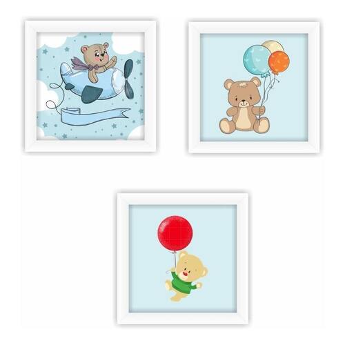 Kit 3 Quadros Infantis Bebe Crianças Com Moldura Ursinhos
