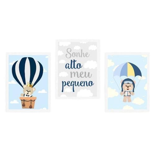 Kit 3 quadros infantis ursinhos 45x34cm - com vidro Moldura: madeira branca Informações do produto Decoração para quarto, sala, cozinha, escritório, área gourmet e muito mais. Chega de paredes vazias Medidas - cada peça tem 45x34cm a3 . Material do papel - papel fotográfico brilhante de altíssima resolução Acabamento - todos os quadros são acompanhados de vidro para proteção da imagem. - Os quadros são embalados de forma segura com plástico bolha com camada dupla de acordo com o tamanho dos quadros. - de 3 meses. Meu quadro chegou. Como posso fixá-lo Você precisa apenas de um martelo e um prego, pois os quadros já vão acompanhados de penduradores. Esta é a forma mais indicada. Como posso limpar meu quadro A limpeza é feita como um móvel comum da sua casa. Apenas um pano seco ou espanador são suficientes para tal