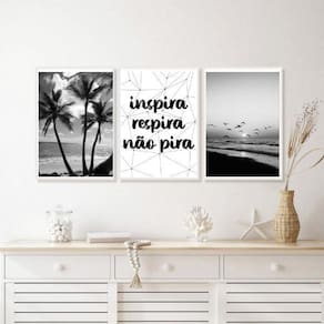 Kit 3 quadros inspira respira não pira praia preto e branco 33x24cm - com vidro Moldura: madeira branca Informações do produto tire todas as suas dúvidas no descritivo abaixo: decoração para quarto, sala, cozinha, escritório, área gourmet e muito mais. Chega de paredes vazias medidas - cada peça tem 33x24cm a4 . Material do papel - papel fotográfico brilhante de altíssima resolução acabamento - todos os quadros são acompanhados de vidro para proteção da imagem. - moldura em madeira maciça na cor preta e pendurador . - os quadros são embalados de forma segura com plástico bolha com camada dupla de acordo com o tamanho dos quadros. Garantia - garantia de 3 meses. Meu quadro chegou. Como posso fixá-lo Você precisa apenas de um martelo e um prego, pois os quadros já vão acompanhados de penduradores. Esta é a forma mais indicada. Como posso limpar meu quadro A limpeza é feita como um móvel comum da sua casa. Apenas um pano seco ou espanador são suficientes para tal Ean: 7891100238140