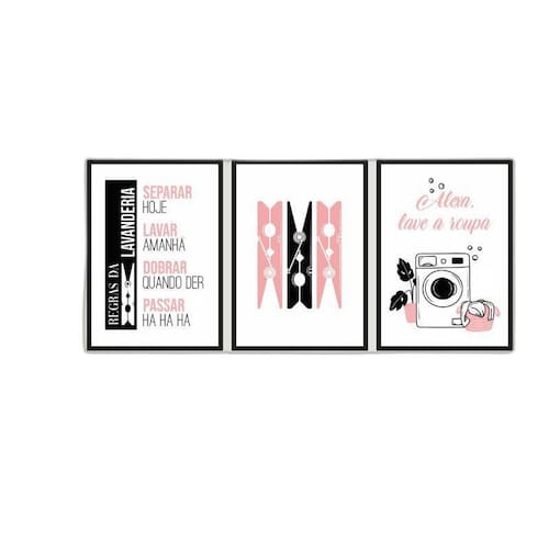 Kit 3 quadros lavanderia alexa lave a roupa 24x18cm