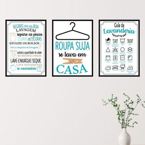 Kit 3 quadros lavanderia azul 33x24cm - com vidro Moldura: madeira preta Informações do produto tire todas as suas dúvidas no descritivo abaixo: decoração para quarto, sala, cozinha, escritório, área gourmet e muito mais. Chega de paredes vazias medidas - cada peça tem 33x24cm a4 . Material do papel - papel fotográfico brilhante de altíssima resolução acabamento - todos os quadros são acompanhados de vidro para proteção da imagem. - moldura em madeira maciça na cor preta e pendurador . - os quadros são embalados de forma segura com plástico bolha com camada dupla de acordo com o tamanho dos quadros. Garantia - garantia de 3 meses. Meu quadro chegou. Como posso fixá-lo Você precisa apenas de um martelo e um prego, pois os quadros já vão acompanhados de penduradores. Esta é a forma mais indicada. Como posso limpar meu quadro A limpeza é feita como um móvel comum da sua casa. Apenas um pano seco ou espanador são suficientes para tal