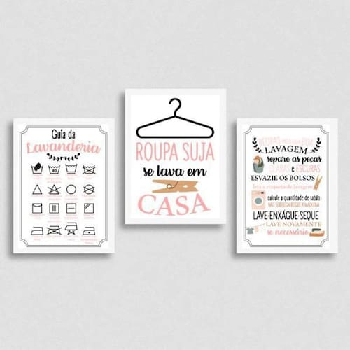 Kit 3 Quadros Lavanderia Rosa 24X18Cm Moldura Branca Moldura: madeira branca Informações do produto tire todas as suas dúvidas no descritivo abaixo: decoração para quarto, sala, cozinha, escritório, área gourmet e muito mais. Chega de paredes vazias medidas - cada peça tem 24x18cm a5 .