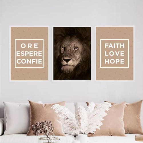 Kit 3 quadros leão ore espere confie 33x24cm Moldura: madeira branca Informações do produtoDecoração para quarto, sala, cozinha, escritório, área gourmet e muito mais. Chega de paredes vazias Medidas - cada peça tem 33x24cm a4 .Material do papel - papel fotográfico brilhante de altíssima resolução Acabamento - todos os quadros são acompanhados de uma película de acetato para proteção da imagem. - os quadros são embalados de forma segura com plástico bolha com camada dupla de acordo com o tamanho dos quadros. Garantia - garantia de 3 meses. Meu quadro chegou. Como posso fixá-lo Você precisa apenas de um martelo e um prego, pois os quadros já vão acompanhados de penduradores. Esta é a forma mais indicada. Caso prefira, você pode utilizar uma fita dupla face neste caso, sugerimos de alta qualidade para evitar que descole e seu quadro caia . Como posso limpar meu quadro A limpeza é feita como um móvel comum da sua casa. Apenas um pano seco ou espanador são suficientes para tal