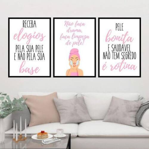 Kit 3 quadros limpeza de pele 24x18cm Moldura: madeira preta Informações do produto tire todas as suas dúvidas no descritivo abaixo: decoração para quarto, sala, cozinha, escritório, área gourmet e muito mais. Chega de paredes vazias medidas - cada peça tem 24x18cm a5 . Material do papel - papel fotográfico brilhante de altíssima resolução acabamento - todos os quadros são acompanhados de uma película de acetato para proteção da imagem. - moldura em madeira maciça na cor branca e pendurador móvel que pode ser retirado facilmente caso deseje fixar com fita dupla face. - os quadros são embalados de forma segura com plástico bolha com camada dupla de acordo com o tamanho dos quadros. - de 3 meses prazo de envio pedimos 24 horas úteis no máximo para enviar seu pedido após o envio, segue os prazos normais dos correios, cerca de 7 exceto para norte e nordeste, que pode ser de até 14 . Em diversas cidades, este prazo normalmente é reduzido, mas depende do prazo dos correios. Meu quadro chegou. Como posso fixá-lo Você precisa apenas de um martelo e um prego, pois os quadros já vão acompanhados de penduradores. Esta é a forma mais indicada. Caso prefira, você pode utilizar uma fita dupla face neste caso, sugerimos de alta qualidade para evitar que descole e seu quadro caia . Como posso limpar meu quadro A limpeza é feita como um móvel comum da sua casa. Apenas um pano seco ou espanador são suficientes para tal Marca: Não Informado