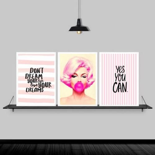 Kit 3 quadros marilyn life your dreams 24x18cm Moldura: madeira branca Informações do produto tire todas as suas dúvidas no descritivo abaixo: decoração para quarto, sala, cozinha, escritório, área gourmet e muito mais. Chega de paredes vazias medidas - cada peça tem 24x18cm a5 . Material do papel - papel fotográfico brilhante de altíssima resolução acabamento - todos os quadros são acompanhados de uma película de acetato para proteção da imagem. - os quadros são embalados de forma segura com plástico bolha com camada dupla de acordo com o tamanho dos quadros. Garantia - garantia de 3 meses. Meu quadro chegou. Como posso fixá-lo Você precisa apenas de um martelo e um prego, pois os quadros já vão acompanhados de penduradores. Esta é a forma mais indicada. Caso prefira, você pode utilizar uma fita dupla face neste caso, sugerimos de alta qualidade para evitar que descole e seu quadro caia . Como posso limpar meu quadro A limpeza é feita como um móvel comum da sua casa. Apenas um pano seco ou espanador são suficientes para tal
