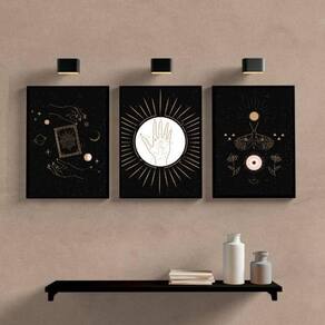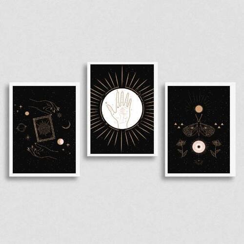 Kit 3 quadros místicos 24x18cm Moldura: madeira preta Informações do produto tire todas as suas dúvidas no descritivo abaixo: decoração para quarto, sala, cozinha, escritório, área gourmet e muito mais. Chega de paredes vazias medidas - cada peça tem 24x18cm a5 . Material do papel - papel fotográfico brilhante de altíssima resolução acabamento - todos os quadros são acompanhados de uma película de acetato para proteção da imagem. - moldura em madeira maciça na cor branca e pendurador móvel que pode ser retirado facilmente caso deseje fixar com fita dupla face. - os quadros são embalados de forma segura com plástico bolha com camada dupla de acordo com o tamanho dos quadros. - de 3 meses prazo de envio pedimos 24 horas úteis no máximo para enviar seu pedido após o envio, segue os prazos normais dos correios, cerca de 7 exceto para norte e nordeste, que pode ser de até 14 . Em diversas cidades, este prazo normalmente é reduzido, mas depende do prazo dos correios. Meu quadro chegou. Como posso fixá-lo Você precisa apenas de um martelo e um prego, pois os quadros já vão acompanhados de penduradores. Esta é a forma mais indicada. Caso prefira, você pode utilizar uma fita dupla face neste caso, sugerimos de alta qualidade para evitar que descole e seu quadro caia . Como posso limpar meu quadro A limpeza é feita como um móvel comum da sua casa. Apenas um pano seco ou espanador são suficientes para tal Marca: Não Informado
