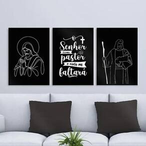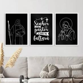 Kit 3 quadros modernos jesus - meu pastor 24x18cm - com vidro Cor: moldura preta Informações do produto tire todas as suas dúvidas no descritivo abaixo: decoração para quarto, sala, cozinha, escritório, área gourmet e muito mais. Chega de paredes vazias medidas - cada peça tem 24x18cm a5 . Material do papel - papel fotográfico brilhante de altíssima resolução acabamento - todos os quadros são acompanhados de vidro para proteção da imagem. - moldura em madeira maciça na cor preta ou branca conforme produto escolhido e pendurador . - os quadros são embalados de forma segura com plástico bolha com camada dupla de acordo com o tamanho dos quadros. Garantia - garantia de 3 meses. Meu quadro chegou. Como posso fixá-lo Você precisa apenas de um martelo e um prego, pois os quadros já vão acompanhados de penduradores. Esta é a forma mais indicada. Como posso limpar meu quadro A limpeza é feita como um móvel comum da sua casa. Apenas um pano seco ou espanador são suficientes para tal