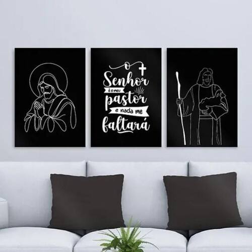 Kit 3 quadros modernos jesus - meu pastor 24x18cm Cor: moldura branca Informações do produto tire todas as suas dúvidas no descritivo abaixo: decoração para quarto, sala, cozinha, escritório, área gourmet e muito mais. Chega de paredes vazias medidas - cada peça tem 24x18cm a5 . Material do papel - papel fotográfico brilhante de altíssima resolução acabamento - todos os quadros são acompanhados de uma película de acetato para proteção da imagem. - os quadros são embalados de forma segura com plástico bolha com camada dupla de acordo com o tamanho dos quadros. Garantia - garantia de 3 meses. Meu quadro chegou. Como posso fixá-lo Você precisa apenas de um martelo e um prego, pois os quadros já vão acompanhados de penduradores. Esta é a forma mais indicada. Caso prefira, você pode utilizar uma fita dupla face neste caso, sugerimos de alta qualidade para evitar que descole e seu quadro caia . Como posso limpar meu quadro A limpeza é feita como um móvel comum da sua casa. Apenas um pano seco ou espanador são suficientes para tal