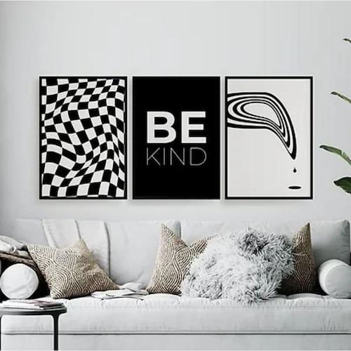 Kit 3 quadros optical art- be kind 24x18cm Moldura: madeira branca Informações do produto tire todas as suas dúvidas no descritivo abaixo: decoração para quarto, sala, cozinha, escritório, área gourmet e muito mais. Chega de paredes vazias medidas - cada peça tem 24x18cm a5 . Material do papel - papel fotográfico brilhante de altíssima resolução acabamento - todos os quadros são acompanhados de uma película de acetato para proteção da imagem. - moldura em madeira maciça na cor preta e pendurador móvel que pode ser retirado facilmente caso deseje fixar com fita dupla face. - os quadros são embalados de forma segura com plástico bolha com camada dupla de acordo com o tamanho dos quadros. Garantia - garantia de 3 meses. Meu quadro chegou. Como posso fixá-lo Você precisa apenas de um martelo e um prego, pois os quadros já vão acompanhados de penduradores. Esta é a forma mais indicada. Caso prefira, você pode utilizar uma fita dupla face neste caso, sugerimos de alta qualidade para evitar que descole e seu quadro caia . Como posso limpar meu quadro A limpeza é feita como um móvel comum da sua casa. Apenas um pano seco ou espanador são suficientes para tal