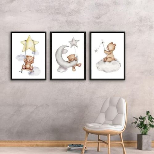 Kit 3 quadros para quarto de bebê ursinhos 24x18cm Moldura: madeira branca Informações do produto tire todas as suas dúvidas no descritivo abaixo: decoração para quarto, sala, cozinha, escritório, área gourmet e muito mais. Chega de paredes vazias medidas - cada peça tem 24x18cm a5 . Material do papel - papel fotográfico brilhante de altíssima resolução acabamento - todos os quadros são acompanhados de uma película de acetato para proteção da imagem. - os quadros são embalados de forma segura com plástico bolha com camada dupla de acordo com o tamanho dos quadros. Garantia - garantia de 3 meses. Meu quadro chegou. Como posso fixá-lo Você precisa apenas de um martelo e um prego, pois os quadros já vão acompanhados de penduradores. Esta é a forma mais indicada. Caso prefira, você pode utilizar uma fita dupla face neste caso, sugerimos de alta qualidade para evitar que descole e seu quadro caia . Como posso limpar meu quadro A limpeza é feita como um móvel comum da sua casa. Apenas um pano seco ou espanador são suficientes para tal