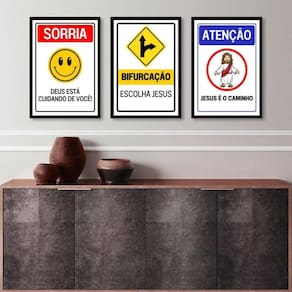 Kit 3 quadros placas cristãs - jesus 33x24cm - com vidro Moldura: madeira branca Informações do produto tire todas as suas dúvidas no descritivo abaixo: decoração para quarto, sala, cozinha, escritório, área gourmet e muito mais. Chega de paredes vazias medidas - cada peça tem 33x24cm a4 . Material do papel - papel fotográfico brilhante de altíssima resolução acabamento - todos os quadros são acompanhados de vidro para proteção da imagem. - moldura em madeira maciça na cor preta ou branca conforme produto escolhido e pendurador . - os quadros são embalados de forma segura com plástico bolha com camada dupla de acordo com o tamanho dos quadros. Garantia - garantia de 3 meses. Meu quadro chegou. Como posso fixá-lo Você precisa apenas de um martelo e um prego, pois os quadros já vão acompanhados de penduradores. Esta é a forma mais indicada. Como posso limpar meu quadro A limpeza é feita como um móvel comum da sua casa. Apenas um pano seco ou espanador são suficientes para tal