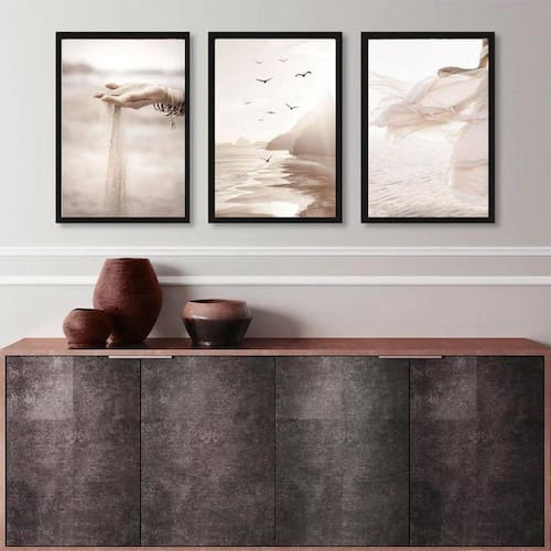 Kit 3 quadros praia bege e marrom- leveza 33x24cm - com vidro Moldura: madeira preta Informações do produto tire todas as suas dúvidas no descritivo abaixo: decoração para quarto, sala, cozinha, escritório, área gourmet e muito mais. Chega de paredes vazias medidas - cada peça tem 33x24cm a4 . Material do papel - papel fotográfico brilhante de altíssima resolução acabamento - todos os quadros são acompanhados de vidro para proteção da imagem. - moldura em madeira maciça na cor preta ou branca conforme produto escolhido e pendurador . - os quadros são embalados de forma segura com plástico bolha com camada dupla de acordo com o tamanho dos quadros. Garantia - garantia de 3 meses. Meu quadro chegou. Como posso fixá-lo Você precisa apenas de um martelo e um prego, pois os quadros já vão acompanhados de penduradores. Esta é a forma mais indicada. Como posso limpar meu quadro A limpeza é feita como um móvel comum da sua casa. Apenas um pano seco ou espanador são suficientes para tal Ean: 7897330709399