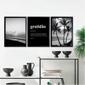 Kit 3 quadros praia preto e branco gratidão significado 33x24cm Moldura: madeira branca Informações do produto tire todas as suas dúvidas no descritivo abaixo: decoração para quarto, sala, cozinha, escritório, área gourmet e muito mais. Chega de paredes vazias medidas - cada peça tem 33x24cm a4 . Material do papel - papel fotográfico brilhante de altíssima resolução acabamento - todos os quadros são acompanhados de uma película de acetato para proteção da imagem. - os quadros são embalados de forma segura com plástico bolha com camada dupla de acordo com o tamanho dos quadros. Garantia - garantia de 3 meses. Meu quadro chegou. Como posso fixá-lo Você precisa apenas de um martelo e um prego, pois os quadros já vão acompanhados de penduradores. Esta é a forma mais indicada. Caso prefira, você pode utilizar uma fita dupla face neste caso, sugerimos de alta qualidade para evitar que descole e seu quadro caia . Como posso limpar meu quadro A limpeza é feita como um móvel comum da sua casa. Apenas um pano seco ou espanador são suficientes para tal Ean: 7892384849794