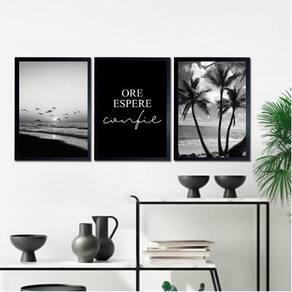 Kit 3 quadros praia preto e branco ore espere confie 24x18cm - com vidro Moldura: madeira branca Informações do produto tire todas as suas dúvidas no descritivo abaixo: decoração para quarto, sala, cozinha, escritório, área gourmet e muito mais. Chega de paredes vazias medidas - cada peça tem 24x18cm a5 . Material do papel - papel fotográfico brilhante de altíssima resolução acabamento - todos os quadros são acompanhados de vidro para proteção da imagem. - moldura em madeira maciça na cor preta e pendurador . - os quadros são embalados de forma segura com plástico bolha com camada dupla de acordo com o tamanho dos quadros. Garantia - garantia de 3 meses. Meu quadro chegou. Como posso fixá-lo Você precisa apenas de um martelo e um prego, pois os quadros já vão acompanhados de penduradores. Esta é a forma mais indicada. Como posso limpar meu quadro A limpeza é feita como um móvel comum da sua casa. Apenas um pano seco ou espanador são suficientes para tal Ean: 7895285920586