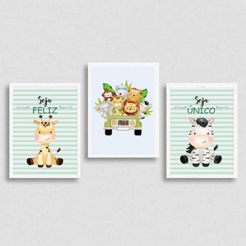 Este Kit 3 Quadros Tema Safari Infantil Seja Feliz é perfeito para complementar a decoração do quarto do seu pequeno aventureiro. Com medidas de 45x34cm A3 , cada peça é produzida em papel fotográfico brilhante de altíssima resolução, garantindo imagens nítidas e vibrantes.