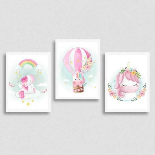 Kit 3 quadros unicórnios - aquarela - balão 24x18cm Moldura: madeira branca Informações do produto tire todas as suas dúvidas no descritivo abaixo: decoração para quarto, sala, cozinha, escritório, área gourmet e muito mais. Chega de paredes vazias medidas - cada peça tem 24x18cm a5 .
