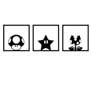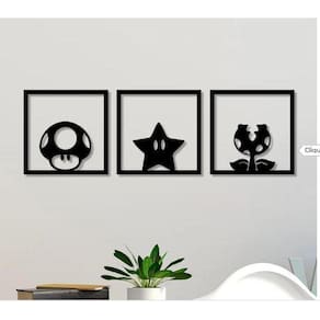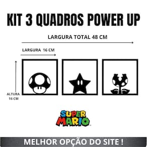Tamanho: Cada quadro: 16cm x 16cm largura x altura . Quantidade de quadros: 3 unidades.Aplicação: Para aplicar o produto basta posicionar a fita dupla face 3m enviada junto com o produto . A aplicação pode ser feita em qualquer parede que seja lisa, fosca e sem indícios de irregularidade. Informações adicionais: Material: mdfEspessura: 3mm Cor: preto Acabamento: foscoEnvio com embalagem reforçada Cuidados:- não molhar;- evitar quedas;- não expor diretamente ao sol;- utilizar em ambientes internos; Marca: Viza 3D Games