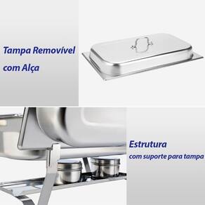 Kit com 3un rechaud retangular 9 litros com 3 cubas O rechaud retangular 9l brinovar ajuda a manter seus alimentos aquecidos por muito mais tempo após o preparo e além de manter suas refeições aquecidas durante o período da refeição, ele também traz um aspecto decorativo para o local, deixando o ambiente gourmet. Com diversas vantagens, o rechaud possui suporte dobrável, o que ocupa menos espaço para transporte de um evento para outro, conta também com alças laterais para facilitar o manuseio, a tampa removível conta com uma escora embutida no suporte para não atrapalhar na hora de servir. Ideal para quem tem um estabelecimento, vai fazer um evento ou sempre gosta de receber um número maior de pessoas em casa. Especificações técnicas: Marca: brinovar Cor: prata Acabamento: acetinado Formato: retangular Material: aço inoxidável 201 Capacidade total: 9 litros Dimensões do produto montado: Comprimento: 35 cm Largura: 63 cm Altura: 30 cm Quantidade de cubas para comida: 3 un Medida de cada cuba para comida: 17 l x 32 c cm Tipo de acendedor: fogareiro Quantidade de acendedor: 2 un Ambiente recomendado: buffet, refeitório, cozinha, festas : 90 dias Cuidados: Esta peça contém bordas cortantes, manusear com cuidado. Não use palha de aço, produtos químicos, não usar ácido muriático, água sanitária ou qualquer outro solvente para lavar objetos na pia. Nunca deixar objetos metálicos sobre a peça por períodos muito longos, para evitar a corrosão. Para manter o brilho do seu rechaut, recomendamos o uso da pasta para polir e remover manchas em superfícies de aço inoxidável. Itens inclusos: 9 cubas para comida gns 1/3 - 3 cubas de comida para cada rechaud 3 cubas para água banho maria - 1 cuba de água para cada rechaud 3 suportes - 1 suporte para cada rechaud 6 fogareiros - 2 fogareiros para cada rechaud 3 tampas - 1 tampa para cada rechaud Marca: Não Informado Ean: 7893590282214