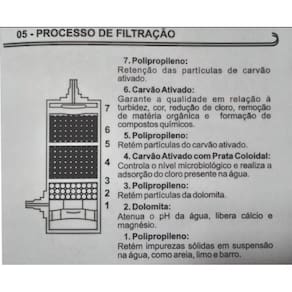Retenção de partículas: classe d Redução de cloro livre : atende aos parâmetros da norma vigente Nível microbiológico : atende aos parâmetros da norma vigente Extraíveis : atende aos parâmetros da norma vigente Eficiência bacteriostática : sim Vida útil : 3.000 litros