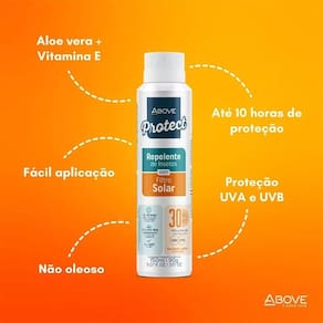 A gente sabe que se cuidar exige bastante dedicação, e os produtos 2 em 1 são uma mão na roda quando o assunto é cuidado e praticidade. Se a aplicação em spray já é prática, com Above Protect Repelente + Protetor Solar essa facilidade vai reinar no seu dia a dia. São 10 horas de proteção contra insetos, pois, esse produto é enriquecido com aloe vera, vitamina E e DEET composto responsável por inibir a ação dos insetos na nossa pele . Tudo isso se alia a uma proteção solar de fator 30 com secagem rápida, evitando que os raios UVA e UVB prejudiquem a pele também.