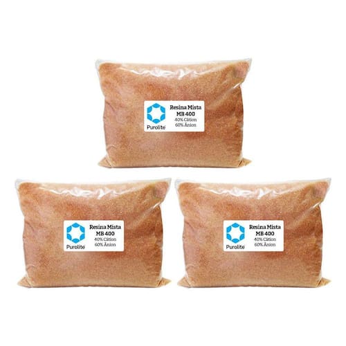 Resina mista MB400 MB 400 tem 40% Catiônica Forte e 60% Aniônica Forte - A água produzida terá condutividade média por volta de 0,1 S/cm para a maior parte da campanha, que pode ser mais extensa dependendo da qualidade final da água requerida. Produção de água desmineralizada com alta pureza, livre de sílica e Alta capacidade de produção .
