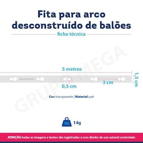 Kit Rolo de fita dupla face com 300 gotas próprio para colar balões de festas + 3 fitas corrente para arco descontruído de balões 5m cadaComposição do kit:3 Rolo de cola dupla face com 100 adesivos cada3 Corrente de 5m cada para arco desconstruído Faça da sua festa de aniversário um verdadeiro espetáculo Com nossos kits de artigos de festas, você poderá criar decorações incríveis, cheias de cores e alegria. As crianças vão se encantar com a magia que os balões trazem para a festaCola para balões:Características:Super fácil de usarIdeal para colar um balão no outroPode ser utilizada para colar balões em paredes ou outras superfícies Super fácil de retirar da paredePermite você criar arranjos e decorações personalizadas incríveis e em pouco tempoCompatível com diferentes tamanhos de bexigas Compatível com balões laminados, bubbles e balões de látex Especificações técnicas:Marca: Grupo Mega Modelo: Fita dupla face para balões Quantidade de adesivos por rolo: 100 Cor: Transparente Circunferência de cada adesivo: 1cmComo usar fita gota dupla face para colar balões:Corte uma ponta de adesivo ainda com o papelCole-a na superfície do balão Retire o papel protetorCole o balão onde desejarCorrente para arco desconstruído: Características:Super fácil de usarFeita com materiais recicláveis a partir de garrafas petPermite você criar arranjos personalizados incríveis e em pouco tempoCompatível com diferentes tamanhos de bexigas ReutilizávelCompatível com balões laminados, bubbles e balões de látex de qualquer tamanhoEspecificações técnicas:Marca: GH3 Festas e Eventos Modelo: Fita para arco desconstruído de balões 5m Quantidade: 1 unidadeMaterial: PETCor: transparenteComprimento: 5m - aproximadamente 100 furosEspaçamento: 3cmLargura: 1,5cmTransforme sua festa em um evento inesquecível com nossos artigos especiais para festas. Deixe sua imaginação voar alto e garanta agora o sucesso do seu eventoObrigado pela visita e boas comprasATENÇÃONossas imagens e textos são registrados e com direito de uso autoral controlado e reservado a essa loja e as lojas parceiras devidamente autorizadas em contrato.