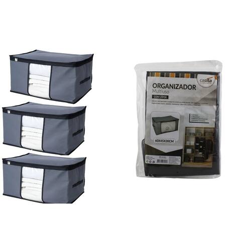 - Ideal para peças volumosas: edredons, cobertas King, Cobertor, casacos e muito mais. - Design compacto e fácil de armazenar. - Visor frontal transparente para fácil visualização do conteúdo. - Material resistente: TNT com plástico no visor. - Fechamento seguro com zíper duplo.