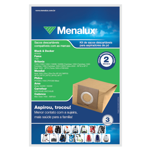 - O Kit com 3 Sacos Descartáveis Menalux é o complemento ideal para facilitar o uso do seu aspirador de pó. Fácil de instalar, seu descarte é prático para que você não tenha nenhum contato com as impurezas aspiradas. Higiene e saúde para você e sua família! Além de promover a limpeza prática de qualquer ambiente, o saco descartável Menalux conserva o bom desempenho do seu aspirador de pó. Sua composição evita que as partículas de poeira danifiquem o motor, o que garante maior vida útil ao aparelho. Biodegradável, o saco descartável Menalux é ecologicamente correto, preservando a natureza e a qualidade de vida das futuras gerações.