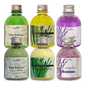 Sais Para Banho - relaxa e suaviza a pele do corpo, tornando seu banho um momento de prazer e repondo suas energias. Quando em infusão na banheira, proporciona uma forte sensação relaxante e . Espuma para Banheira - proporciona espuma cremosa e uma agradável fragrância. CAMPIM LIMÃO - , cítrico, refrescante & revitalizante VERBENA - Aroma cítrico, com notas frescas e verdes. Relaxante,uma agradável sensação de bem estar e frescor. LAVANDA - , relaxante, combate a insônia e equilibra as emoções. Modo de usar: Coloque quantidade suficiente em água morna dos Sais para Banho Capim Limão ou Verbena, deixe-se relaxar e sinta seus benefícios. Espuma de Banho 250ml. Relaxa e suaviza a pele do corpo, tornando seu banho num momento de prazer, repondo suas energias. Quando em infusão na banheira, proporciona uma forte sensação relaxante e . Modo de usar: Coloque quantidade suficiente em água morna, deixe-se relaxar e sinta seus benefícios. Kit Acompanha: 1 Sal De Banho para Banheira Verbena 250g 1 Sal De Banho para Banheira Capim Limão 250g 1 Sal De Banho para Banheira Lavanda 250g 1 Espuma De Banho e Banheira Verbena 250ml 1 Espuma De Banho e Banheira Capim Limão 250ml 1 Espuma De Banho e Banheira Lavanda 250ml Produto não testado em animais.