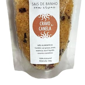 Kit 3 sal de banho cravo e canela com ervas banheira ilê wurá Sais de banho cravo e canela - relaxante, anti-, reenergiza e proporciona ação de bem estar. Para chuveiro ou banheira. Produto artesanal com finalidade ritualística e fitoenergética. Não cosmético, não alimentício. Contém sal grosso, ervas desidratadas e essência. Contém corante. Esse sache contém 150 gramas. Como utilizar ------------- - na banheira, para relaxar e ter uma experiência incrível no seu banho, basta adicionar algumas colheres na banheira e encher com água morna; - no chuveiro como esfoliante, usando as mãos ou uma buchinha para banho, passar levemente no corpo; - como escalda pés, adicionando 2 colheres dos sais em uma bacia com água morna.