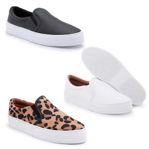 Slip On é uma peça curinga para o dia a dia. Confeccionados em material tecnológico e forro em material têxtil trazendo conforto ao caminhar. Além de seu solado flatform 4cm emborracha antiderrapante que transmite toda segurança. Kit comporto por 3 pares.