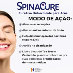 Kit 3 spinacure curativo acne 36un. Hidrocoloide impregnado tea tree e calendula, sache ziper O que é spinacure curativo hidrocoloide para acne e espinhas micrex-bioworld Anvisa 80551589008 - o spinacure curativo hidrocoloide para acne e espinhas, impregnado com óleos tea tree e calendula micrex-bioworld, primeiro curativo de gel hidrocoloide impregnado de princípios ativos dermocosméticos óleo de tea tree e de calêndula para acnes e espinhas, ajuda no processo da cicatrização de forma discreta e não medicamentosa. Indicações: - acne e espinhas. - pode ser desde os primeiros sinais de aparecimento das espinhas ajudando a prevenir o agravamento e a formação de novas lesões de acne, Vantagens: - fácil aplicação, discreto, ajuda a esconder as lesões, pode ser utilizado durante a noite ou durante o dia. Podendo ser colocado embaixo da maquiagem. - pode ser utilizado em qualquer fase evolutiva. - seguro e eficiente, não medicamentoso - tratamento localizado e resultados visíveis Modo de uso: 1. Lave as mãos com sabão antes e depois da aplicação. 2. Assegure-se de que a pele está limpa e seca. 3. Abra o sachê individual e escolha um curativo do tamanho adequado para cobrir a lesão. 4. Retire delicadamente o curativo do filme suporte, colocando na ponta do dedo com a face adesiva para cima. 5. Aplique o curativo sobre a lesão, pressionando suavemente para garantir uma boa adesão. 6. Use preferencialmente um curativo de tamanho maior que a lesão para uma aplicação correta e máxima eficácia. 7. Não manter o mesmo por mais de 12 horas. Uso único recomendado. a troca também é recomendada caso a cor do curativo se tornar opaca. - pode usar durante o dia bem como durante a noite. - pode aplicar maquilagem sobre o curativo, garantindo uma aplicação discreta Princípios ativos: Gel hidrocoloide Tea tree oil Calêndula oil Modo de ação: - é um curativo autoadesivo semipermeável transparente com tecnologia hidrocoloide que absorve as secreções e atua no micro entorno das lesões criando um ambiente úmido que amolece a acne favorecendo a cicatrização e alivia eventual coceira. o curativo contém óleo de tea tree e de calêndula plantas conhecidas por suas propriedades dermocosméticas e agindo de forma mecânica reforçando a proteção lipídica superficial da epiderme. o curativo também age com barreira mecânica, isolando as lesões, evitando mais contaminação e disseminação das bactérias responsáveis. - existem diferentes tipos de acne. O tempo para cicatrização de cada uma é diferente. Por exemplo, em acnes de grau um, também conhecidas como comedônicas, com a utilização correta do curativo, hidrocoloide para acnes e espinhas, é esperado uma média de 3 dias para que elas sumam ou diminuam. Enquanto em acnes de grau 2, também chamadas de pápulo-pustulosa a média de dias varia entre 5 a 6 dias, utilizando de 5 a 8 curativos. Apresentações: - curativo autoadesivo semipermeável, cor transparente, em formato circular, 2 tamanhos de diâmetro 8mm e 12mm , espessura 0,22mm. - sachê alumino com zíper com 36 curativos transparente 24 unidades. Com diâmetro 8mm e 12 unidades. Com diâmetro 12mm .
